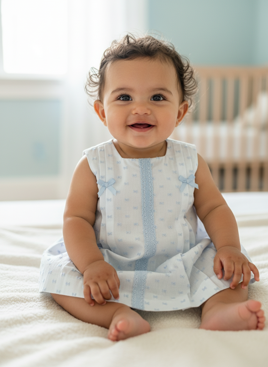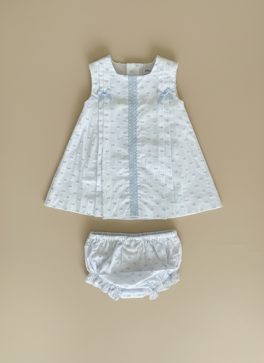 Jesusin Vestido – Blanco estampado azul – 100% algodón – Incluye bloomer / braguita