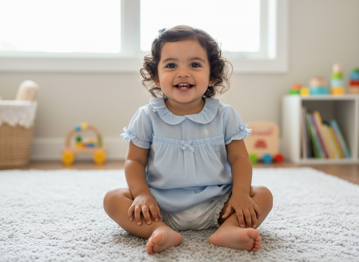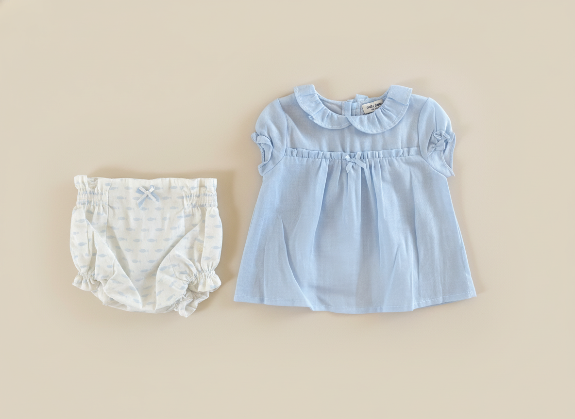 Conjunto – Blusa azul – Bloomer blanco estampado azul – 100% algodón