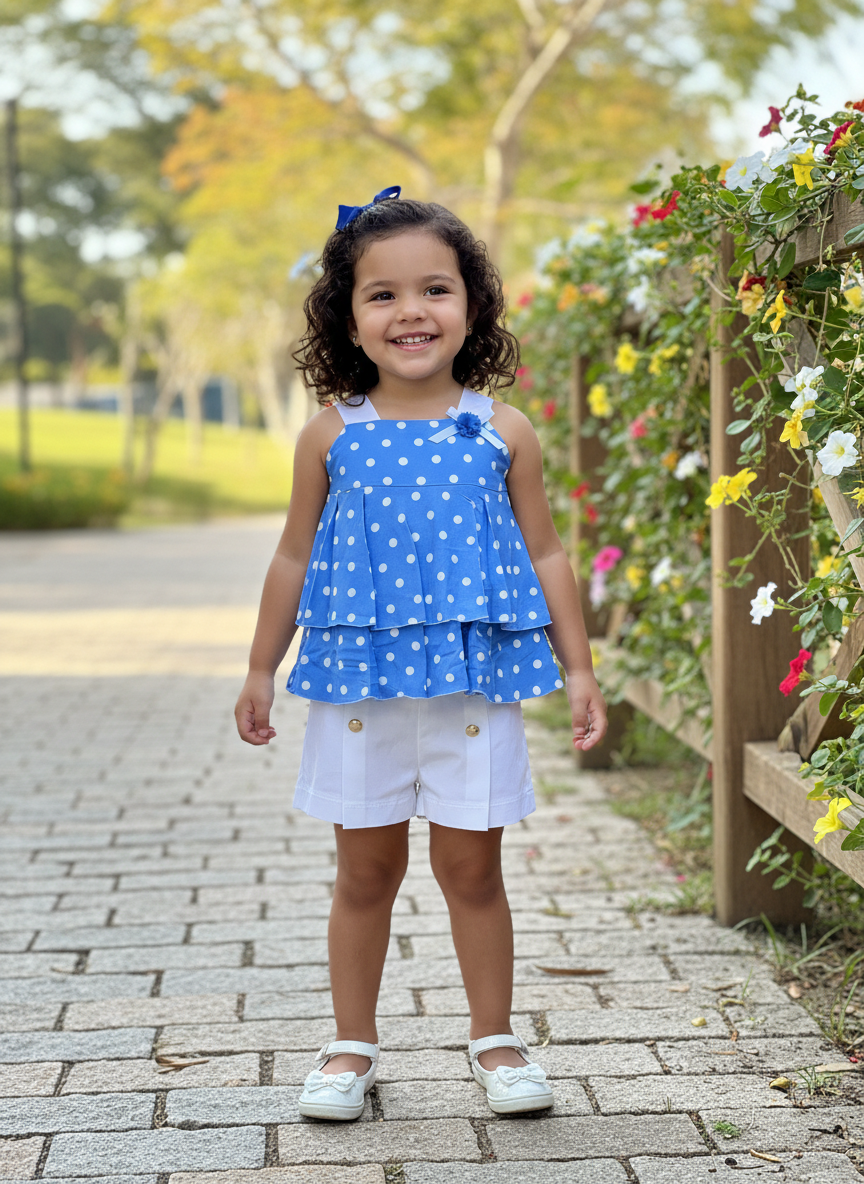 Conjunto – Blusa azul bolitas blancas – Pantalón corto blanco – Blusa 100% viscosa – Forro 100% algodón – Pantalón 95% algodón 5% elastano