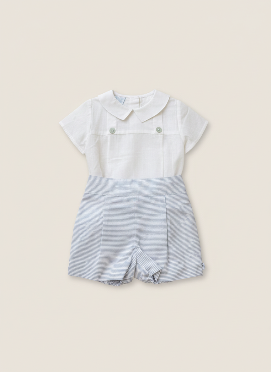 Conjunto – Camisa mangas cortas blanca – Pantalón corto rayas blancas y azul grisáceo – Camisa 100% algodón – Pantalón 100% algodón