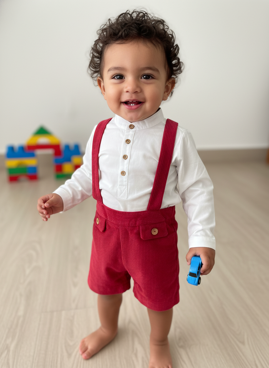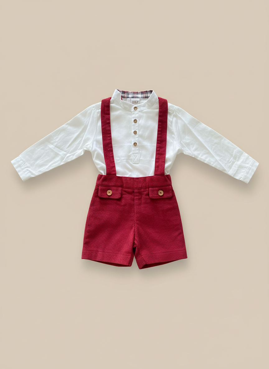 Conjunto – Camisa mangas largas blanca – Pantalón corto con tirantes rojo – Camisa 100% algodón – Pantalón 95% poliéster 5% poliamida
