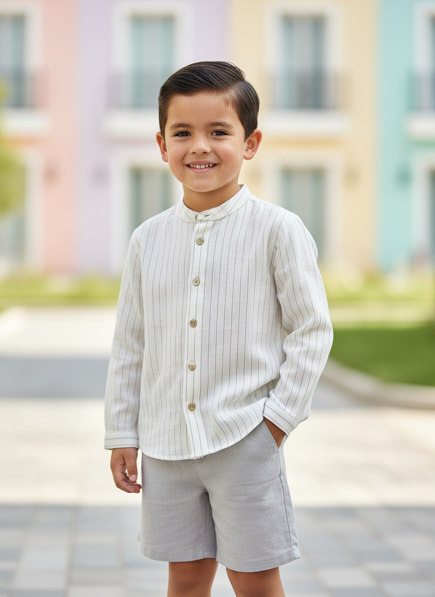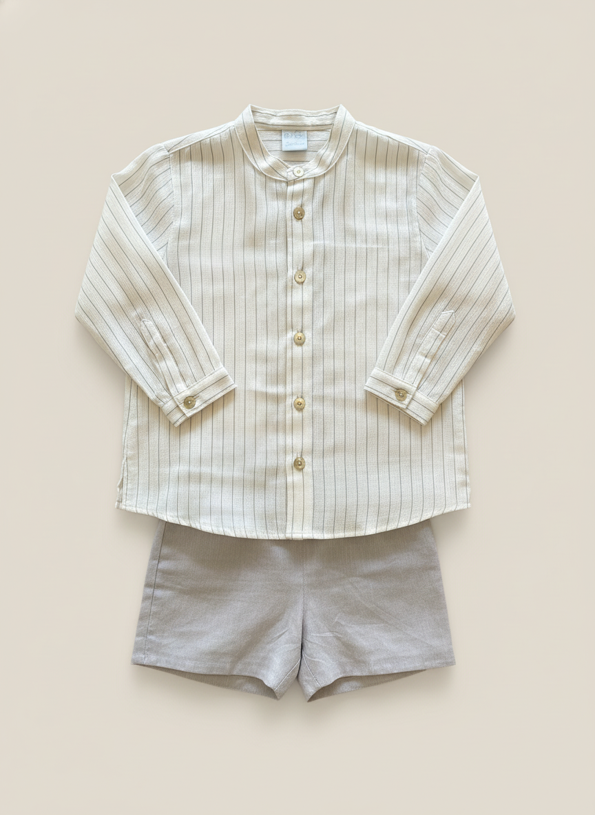 Conjunto – Camisa mangas largas blanca rayas gris – Pantalón corto gris – Camisa 72% algodón 22% lino 6% poliéster – Pantalón 100% algodón
