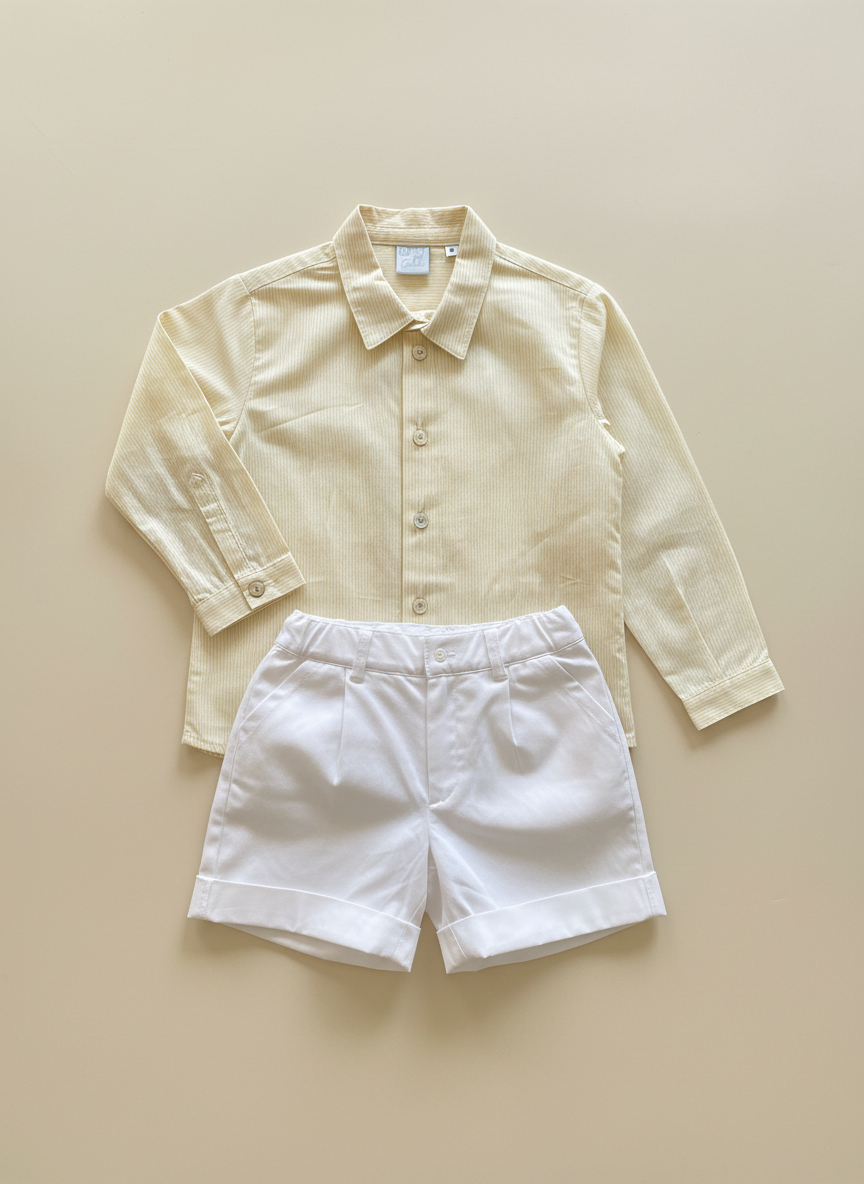 Conjunto – Camisa mangas largas rayas amarillas y blancas – Pantalón corto blanco – Camisa 100% algodón – Pantalón 98% algodón 2% lycra
