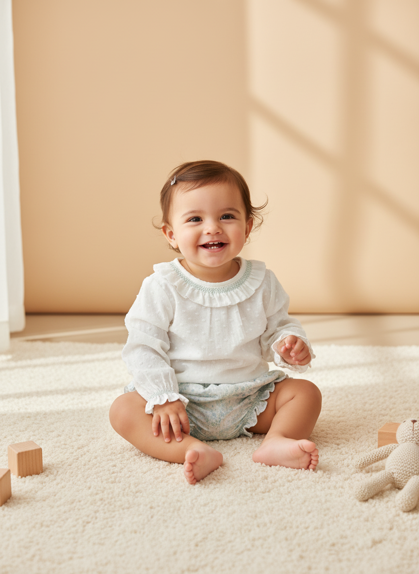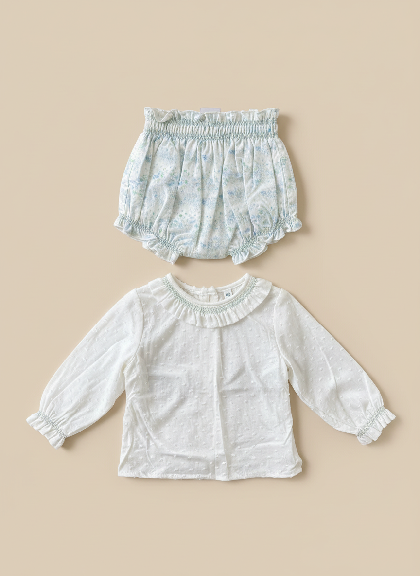 Conjunto – Blusa off white – Bloomer estampado floral verde lago – 100% algodón