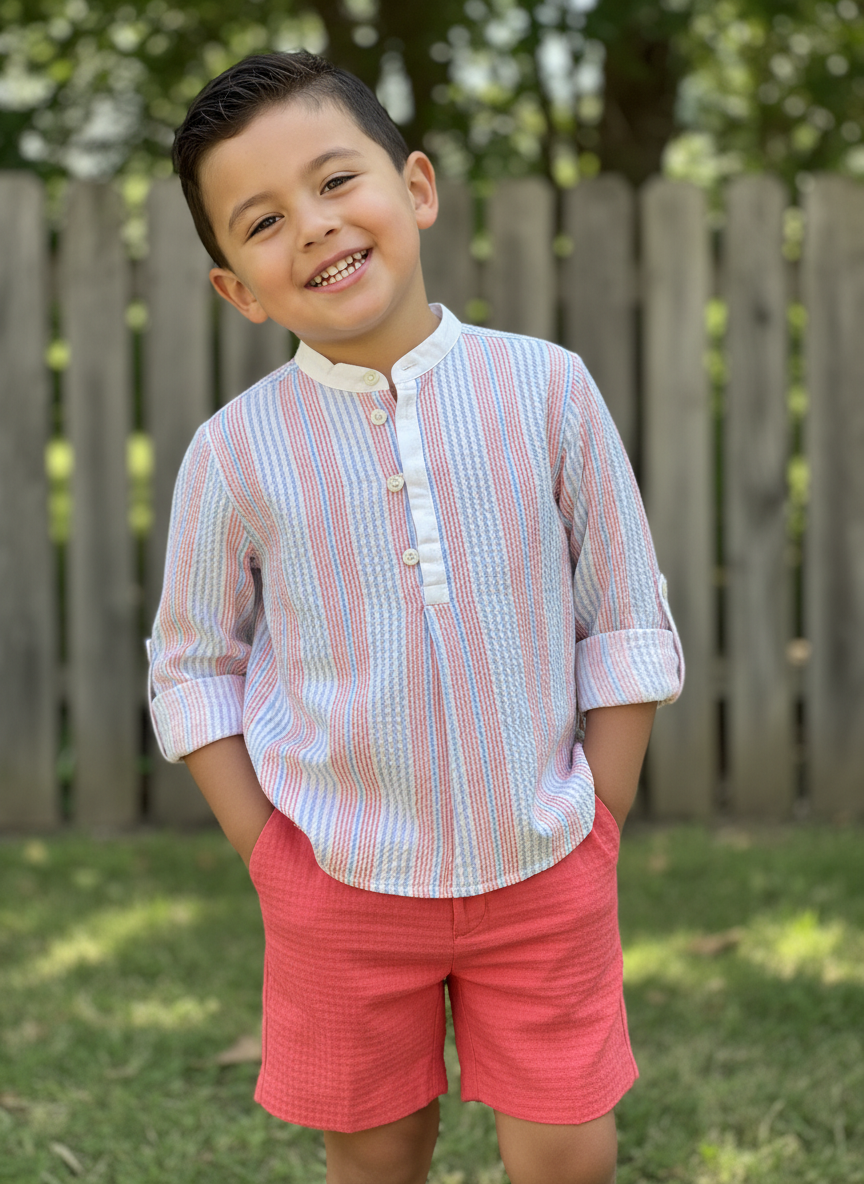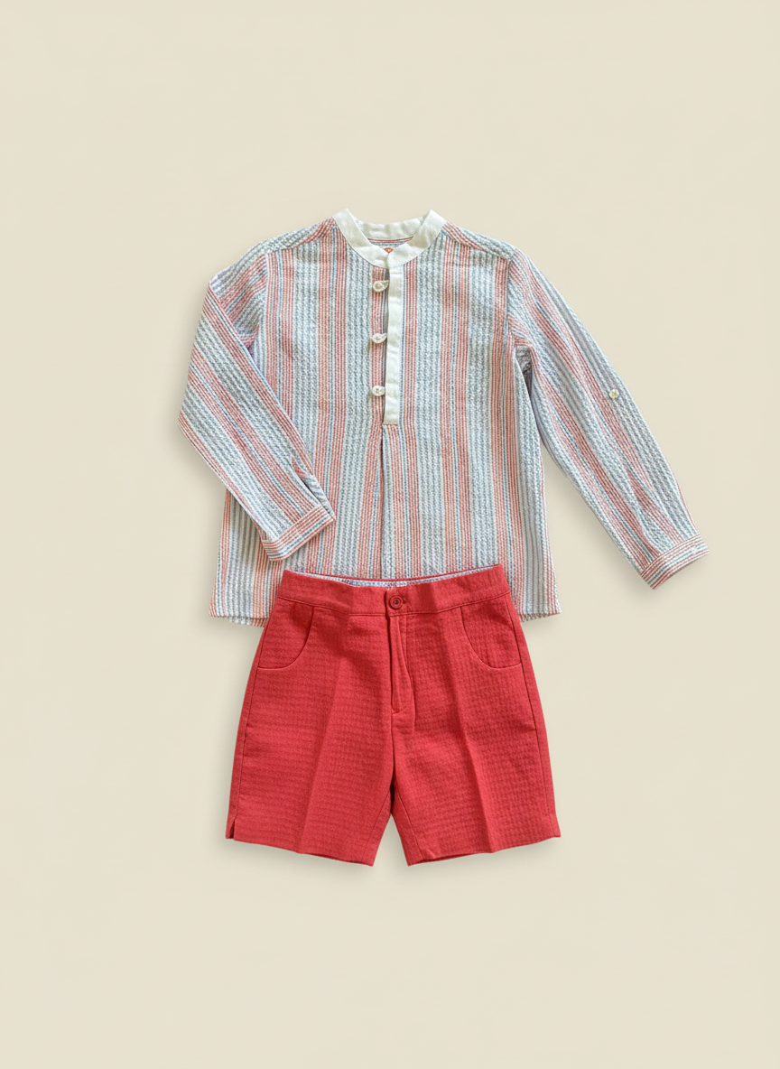 Conjunto – Mangas largas rayas rojas y azules – Pantalón corto rojo – Camisa 98% algodón 2% elastano – Pantalón 100% algodón
